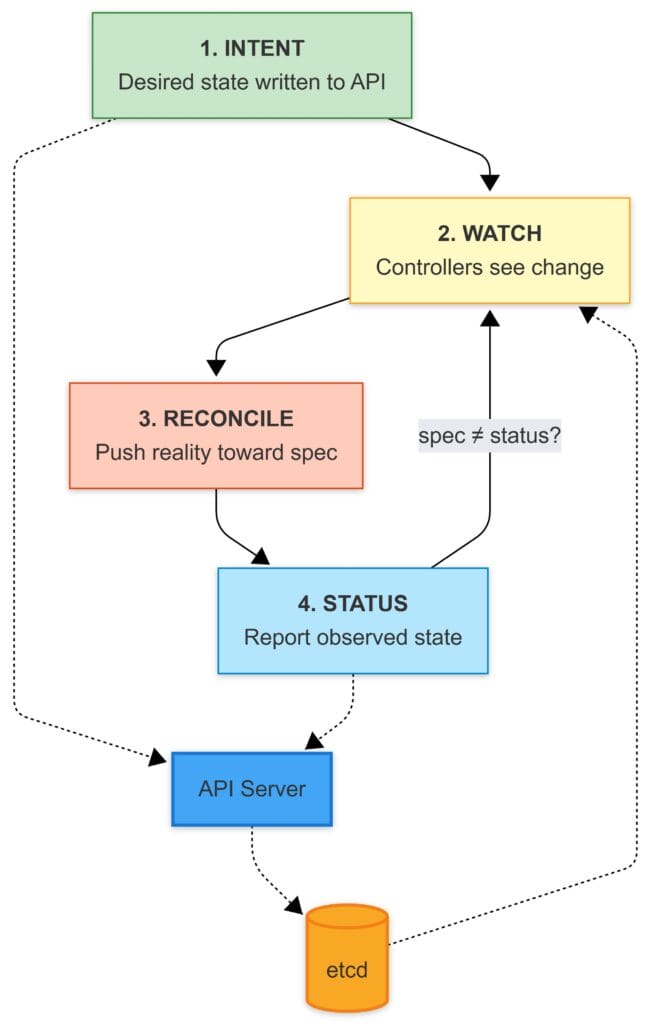 Once stored, controllers/operators(Loops) watch those objects and run reconciliation to push the real world toward what’s declared.